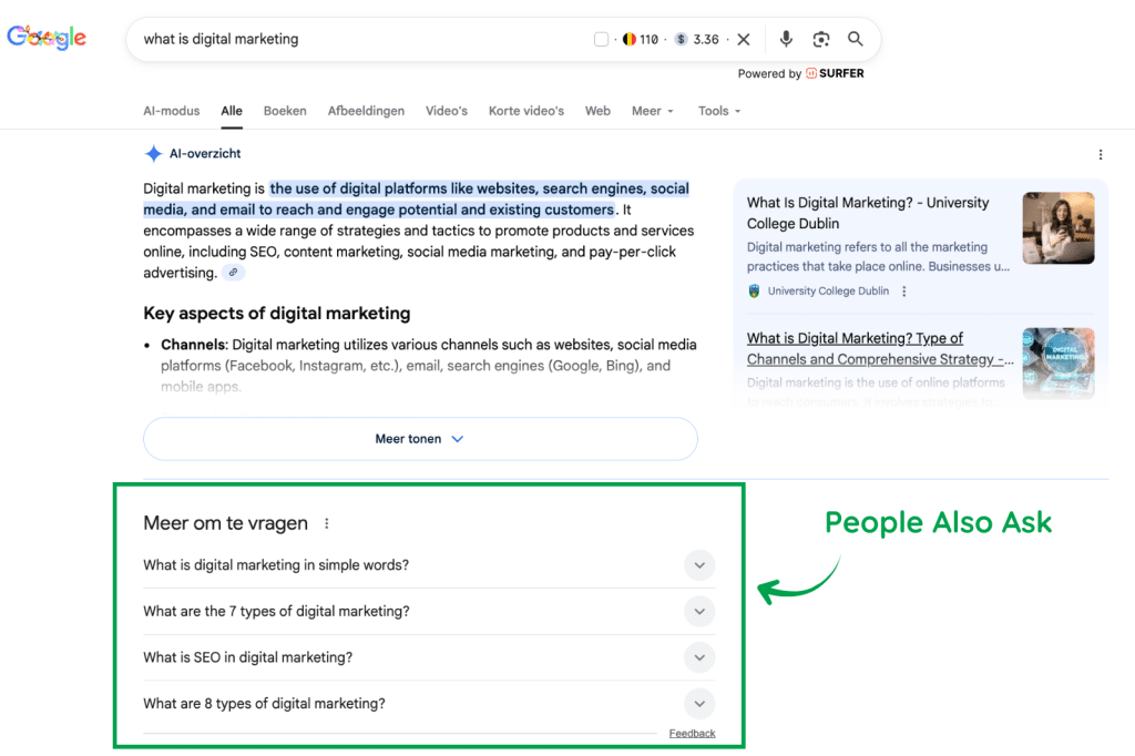 Home / Encyclopedie / SEO / People Also Ask People Also Ask People Also Ask (PAA) is het onderdeel in Google dat een reeks veelgestelde vragen toont die gerelateerd zijn aan jouw zoekopdracht. Onder elk antwoord vind je een uitklapbaar vak met extra informatie, afkomstig van verschillende websites. PAA helpt gebruikers om snel meer context en verdieping te vinden over hun onderwerp. Wat is People Also Ask precies? Wanneer je iets opzoekt in Google, verschijnen vaak enkele vervolgvragen. Dat is het People Also Ask-blok. Google kiest deze vragen op basis van wat andere gebruikers vaak opzoeken. De antwoorden worden automatisch opgehaald van relevante websites, vergelijkbaar met featured snippets. Waarom is People Also Ask belangrijk? PAA biedt een extra kans om zichtbaar te zijn op de eerste pagina van Google, zelfs als je website niet op nummer 1 staat. Elk PAA-vak toont de naam en link van de bronwebsite, wat zorgt voor meer verkeer, autoriteit en herkenbaarheid. Bovendien laat het zien dat je content goed aansluit op de zoekintenties van gebruikers. Hoe kom je in People Also Ask terecht? Beantwoord vragen die je doelgroep stelt, duidelijk en beknopt. Gebruik koppen (H2/H3) met vraagvormen in je teksten. Voeg structured data of schema markup toe om je content beter begrijpbaar te maken. Analyseer bestaande PAA-vragen met tools zoals AlsoAsked of Semrush. Wat dit betekent voor jouw SEO People Also Ask laat je zien waar je doelgroep nieuwsgierig naar is. Door strategisch in te spelen op die vragen, vergroot je je kans op extra zichtbaarheid, verkeer en merkvertrouwen en versterk je je SEO met content die perfect aansluit op zoekintentie, zonder dat je per se hoger hoeft te ranken in de standaard zoekresultaten. Mogen we je omverblazen? Website laten maken Online marketing uitbesteden Geschreven doorElisa Zichtbaar zijn in Google? Daar zorgt Elisa voor. Als SEO marketeer is ze de strategische kracht achter onze zoekmachine-aanpak. Met een analytische blik en diepgaande SEO-kennis zorgt ze ervoor dat onze klanten beter gevonden worden in Google. Gerelateerde termen over "SEO" 301 redirect 302 redirect 307 redirect 308 redirect 404 410 500 503 Ahrefs Klaar om kennis te maken? We blazen je niet omver met loze beloftes, maar met strategie, creativiteit en bewezen impact. Ontdek wat we samen voor jouw business kunnen betekenen. Bekijk onze cases Contacteer ons